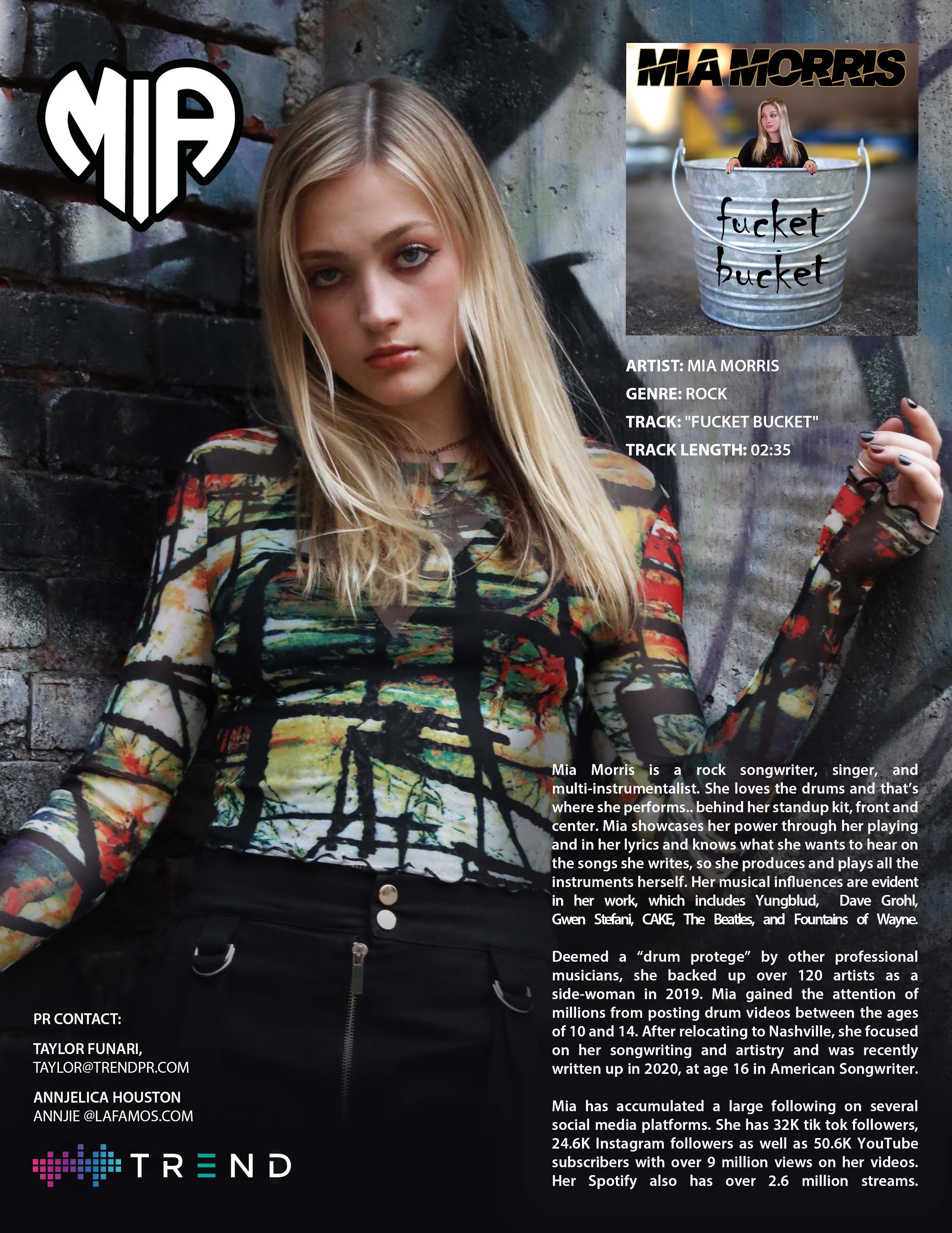 Deemed a “drum protege” by other professional musicians, she backed up over 120 artists as a side-woman in 2019. Mia gained the attention of millions from posting drum videos between the ages of 10 and 14. After relocating to Nashville, she focused on her songwriting and artistry and was recently written up in 2020, at age 16 in American Songwriter.
